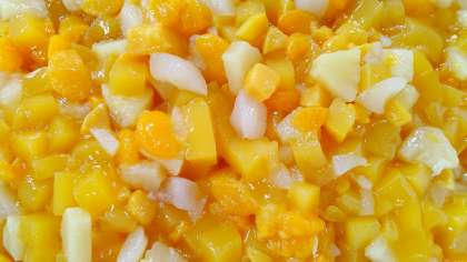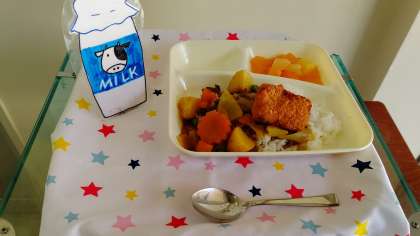 入学祝い献立です。児童に毎回好評な『カツカレーライス』です。一口トンカツをのせて食べます。今日は、ラッキー人参の日です。調理員さんが、人参をハート、星、お花の形にくりぬいてくれました。誰のもとに届いたのか楽しみです。『フルーツゼリー』は、ダイスカット状のみかんゼリーを使用し、フルーツミックス缶をあわせた一品です。甘くて美味しかったです。
