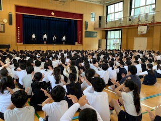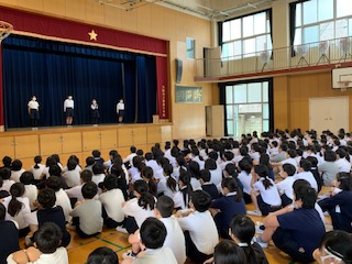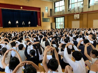 本日、集会委員会による全校集会を行いました。集会委員会が考えた、学校に関するクイズにみんな楽しそうに〇か×で答えていました。次の全校集会は、5月6日の予定です。