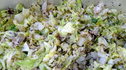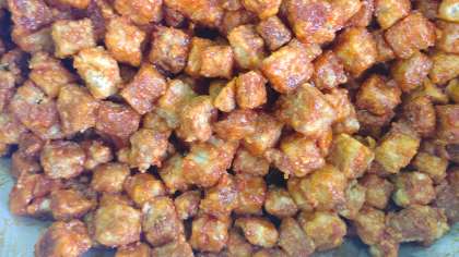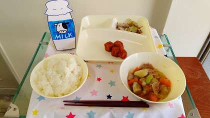 『まぐろのオーロラ煮』は、しょうが汁、料理酒で下味をつけたまぐろにでん粉をまぶし、油であげ、ケチャップ、砂糖、赤みそで作ったタレをからめています。児童に大人気の献立です。『キャベツの赤じそあえ』は、蒸したキャベツに赤じその風味を効かせたタレであえています。豚肉と野菜の煮ものといっしょに美味しく頂きました。