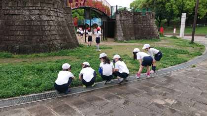昨日から空の様子を眺めては、「明日の遠足行けるかな?」とドキドキしていた子どもたち。みんなの行きたい強い気持ちが雨をやませてくれ、今日は3年生・4年生で一緒に深北緑地へ行くことができました!