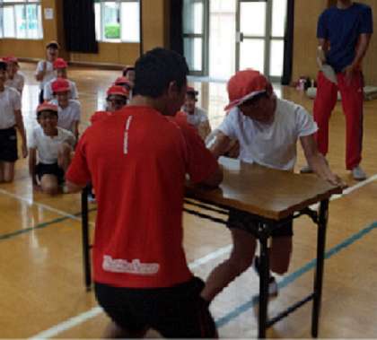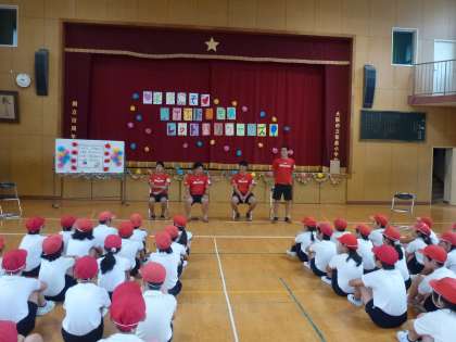 今日の2,3時間目に,トップアスリート小学校ふれあい事業がありました。ラグビーのトップリーグ,NTTドコモレッドハリケーンズの選手の皆さんが来校されました。最初は,講堂で質問に答えていただきました。ラグビーの魅力や始めたきっかけ,小さい頃の夢や毎日のご飯の量など,子どもたちは目を輝かせて聞いていました。選手の体の大きさや筋肉にびっくり!!腕相撲にも挑戦しましたが,完敗でした。