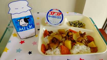 牛肉と大豆のカレーライス キャベツのひじきドレッシング ヨーグルト 牛乳