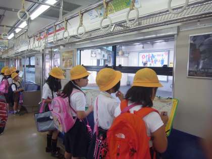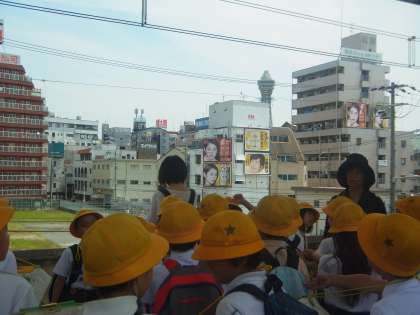 今日の(10日)2・3時間目、3年生は「環状線一周」の社会見学に行きました。走る電車の中から見学し、山や川、大きな建物、車庫や工場など、それぞれの町の様子について知ることができました。新今宮駅や大阪駅では下車し、通天閣やハルカス、観覧車やビル群なども見学しました。みんな熱心に見学しメモをとっていました。