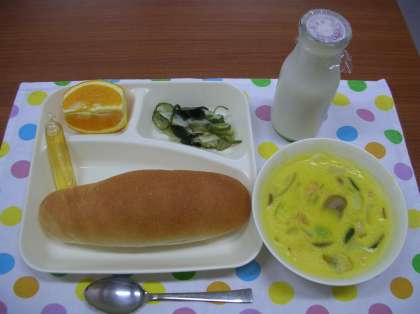 「かぼちゃのクリームシチュー」は、給食室でルゥから作っています。また、かぼちゃは旬を迎える食材ですので、生のものを使いました。シチューは、すこし気温が低い方がおいしく感じますが、梅雨の時期のシチューも好評でした。