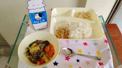 『肉じゃが』は、牛肉とじゃがいもを主材に、糸こんにゃく、たまねぎ、にんじん、さんど豆を使用した毎回好評な定番の煮ものです。『ごまかかいため』は、旬のたけのこを、かつおぶし、いりごまといっしょに炒めています。ご飯のすすむ一品です。もやしのゆずの香あえといっしょに美味しく頂きました。
