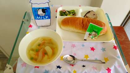 かつおのガーリックマヨネーズ焼き スープ グリーンアスパラガスとベーコンのソテー コッペパン ソフトマーガリン 牛乳