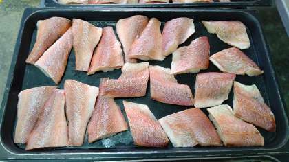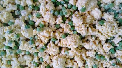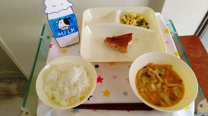 『赤魚のしょうゆだれかけ』は、塩で下味をつけ、焼いた赤魚に、料理酒、みりん、薄口しょうゆで作ったたれをかけています。『えんどうの卵とじ』は、旬のさやつきのえんどうを給食室でむいて使用します。鶏ひき肉と煮て卵とじにしています。みそ汁といっしょに美味しく頂きました。