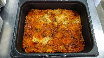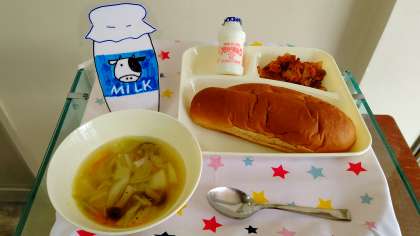 『じゃがいものミートグラタン』は、じゃがいもにケチャップ味のミートソースを合わせたグラタンです。焦げ目が香ばしく、食欲をそそる児童に大人気の献立です。粉末チーズを使用していないので、乳アレルギーのある児童も食べることができます。スープ、発酵乳が1人1本ずつつきました。