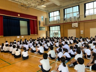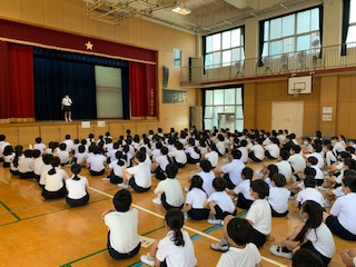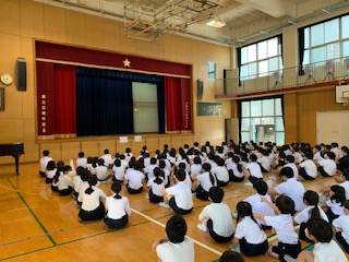 今日は、講堂で児童集会を行いました。「何が通ったかクイズ」をしました。ボールやランドセル、防災頭巾などがステージを通るのを、子どもたちは楽しそうに見て答えていました。