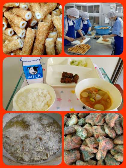 『ちくわのいそべあげ』は、ちくわに青のりを加えた衣をつけ、あげています。児童に大人気の献立です。『厚揚げと里芋のみそ煮』は、厚揚げと里芋の他に、鶏肉、つなこんにゃく、たまねぎ、にんじん、青みにむきえだまめを使用し、さとう、濃い口しょうゆ、赤みそで味付けし煮含めています。ごはんが進む献立でした。