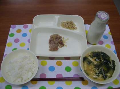 豚肉の甘辛焼き、みそ汁、もやしのごま酢あえ、ごはん、牛乳