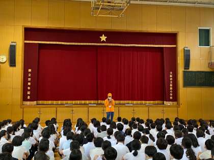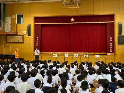 今朝の児童朝会は久しぶりに講堂で行われました。登下校の見守りや校内巡視、区内の安全パトロールをされている「フッピー隊」の方が、朝会に来てくださいました。オレンジのベストと帽子が目印です。「知らない人にはついていかない」や、下校時の交通安全等についてのお話がありました。今年もお世話になります。よろしくお願いします。