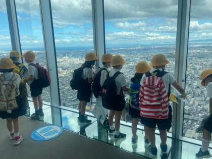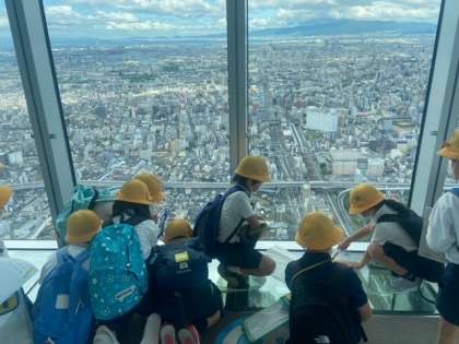 環状線一周では、駅の発車メロディーを聞いたり、電車の窓から見える建物を見つけたりしていました。あべのハルカスでは、「わぁ、すごい。」と60階からの景色にとても驚いていました。「福島小学校はどこかな。」「通天閣を見つけました。」と一生懸命大阪市の様子を観察していました。天候に恵まれ、なかなか見ることのできない明石海峡大橋を見ることができました。