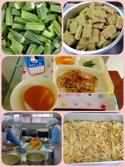 『和風焼きそば』は、豚肉、いかを取材に使用したしょう油味の焼きそばです。食べる時にかつおぶしをかけます。パンにはさんで食べている児童をたくさん見かけました。オクラの甘酢あえといっしょに美味しく頂きました。