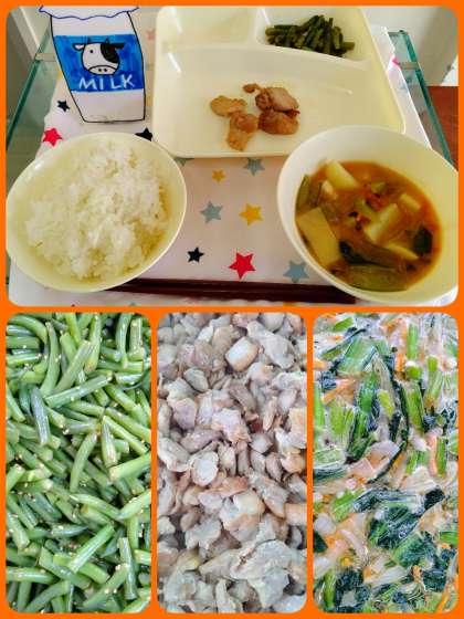 『鶏肉のしょうゆバター焼き』は、鶏肉に料理酒、濃口しょうゆで下味をつけ、溶かしバターをかけて風味よく焼いています。『さんど豆のごまあえ』は、さんど豆をゆで、ねりごま、砂糖、濃い口しょうゆで作ったタレをかけ、いりごまをふり、あえています。6月は、生のさんど豆を使用しています。みそ汁といっしょに美味しく頂きました。