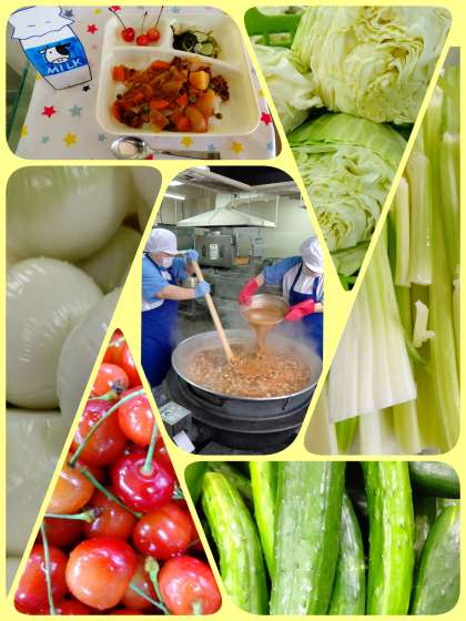『ハヤシライス』は、牛肉、じゃがいも、玉ねぎ等の具材をトマトピューレ、ケチャップで煮込み、デミグラスソース、ウスターソース、トンカツソース等で味付けし、調理員さん手作りのブラウンルウでとろみをつけています。児童に人気の献立です。旬のさくらんぼは、1人3個ずつです。甘くて美味しかったです。