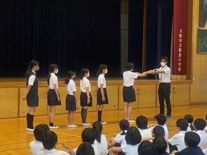 6月19日(日)に下福島グラウンドで、福島区子ども会親善キックベースボール大会とソフトボール大会が行われましたが、福島キッズクラブキックベースボールチームが、大開小学校の子どもたちとの合同チームで参加し、見事に準優勝したので、賞状を渡しました。当日に一人一人に渡されたメダルも、みんなの前で披露しました。キャプテンからは新たなメンバーを募集していることが伝えられました。みんなから大きな拍手をもらって、メンバーの子どもたちはとてもうれしそうでした。