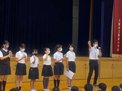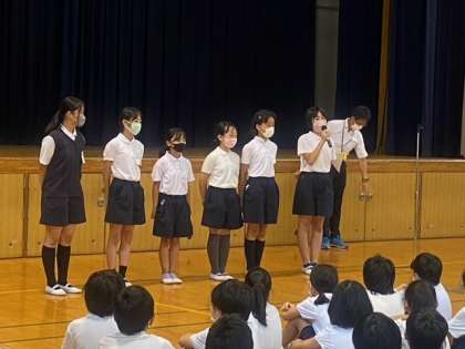 毎月初めの月曜日は、運動場で児童朝会を行うのですが、今日は朝から雨が降っていたので講堂で行いました。