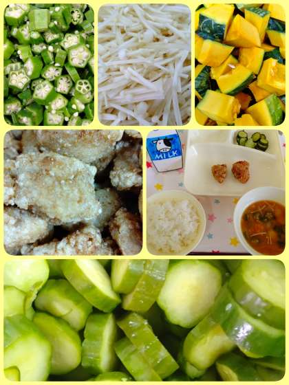 『豚肉のたつたあげ』は、豚肉にしょうが汁、料理酒、こい口しょうゆで下味をつけ、あげています。児童に人気の献立です。『みそ汁』は、旬のかぼちゃ、オクラ、とうふ、玉ねぎ、えのきたけを使用したみそ汁です。さっぱりとした味付けのきゅうりの甘酢づけといっしょに美味しく頂きました。