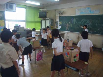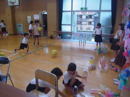 今日(25日)の1〜3時間目に、校内オリエンテーリングを行いました。たてわり班でゲームコーナーを準備しましたので、11種類ありました。それぞれに、どの学年の人も楽しく遊べるゲームを用意し、場づくりにも工夫を凝らしていました。店当番で活躍する人、班のリーダーとして活躍する人、みんながめあてを持って楽しく活動できたようです。音楽集会で練習した、「みんなで歌おう」の「さんぽ」もバッチリでした。本番の今日が、一番素敵な歌声でした。