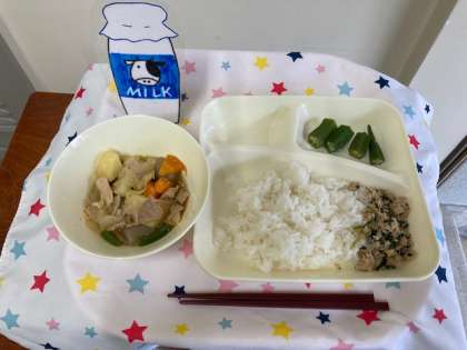 ごはん・牛乳・豚肉とじゃがいもの煮もの・オクラの梅風味・ツナっ葉いため
