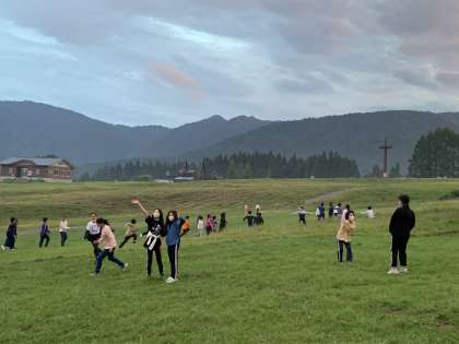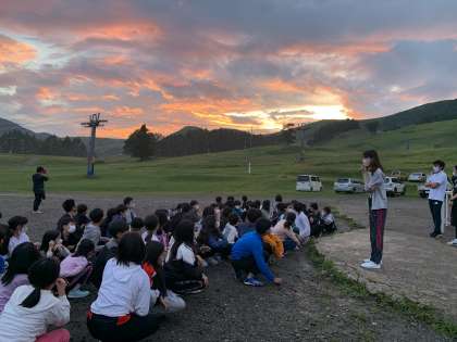 宿舎の前は広い原っぱになっているので、自由に散策をしています。自然の中を散歩したり、生き物を探したり、走り回ったり、楽しく過ごしています。陽が落ちてくると、肌寒いくらいの気温になってきました。