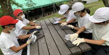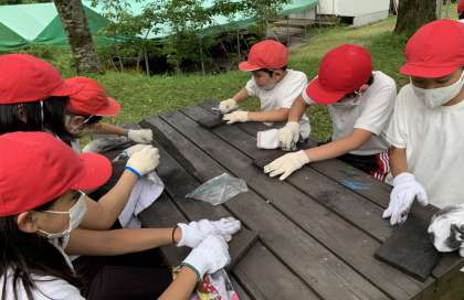焼き板工作をしています。タオルで一生懸命擦って作っています。