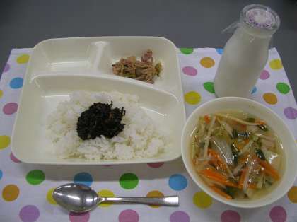 給食の「のりのつくだ煮」は、細かく砕いたかつおぶしとしいたけ、きざみのりで作ります。きれいに切れているのりを使って作るので少しもったいない感じがしますが、味はとてもおいしいです。子どもたちに大好評でした。(栄養教諭)
