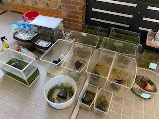 学校では、ふくふく広場のトマトやヘチマなどの植物もどんどん成長してきています。玄関前の生きものたちもみんな元気です。