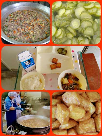 『厚揚げのみそだれかけ』は、厚揚げを蒸し焼きにし、赤みそ、砂糖、濃い口しょうゆで作ったタレをかけています。たくさんの児童から「肉じゃが好き〜」と声を掛けてもらいました。以外に厚揚げも好きと言う児童もたくさんいました。ご飯がすすむ献立で美味しく頂きました。