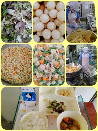 今日は、月見の行事献立です。『一口がんもと里芋のみそ煮』は、十五夜が「芋名月」と言われる事や、十五夜に里芋を供える習慣があることから、里芋を使用した献立となっています。今年は9月10日が十五夜です。『みたらしだんご』は、ちょうど良い甘さで美味しかったです。