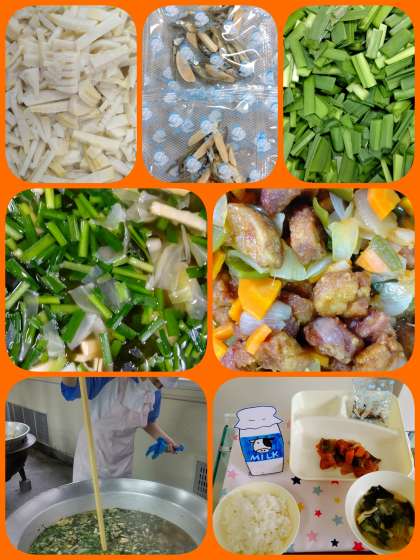 『酢豚』は、玉ねぎ、にんじん、ピーマンをいため、甘酢あんで味付けし、油であげた豚肉を加えています。児童に大人気の献立です。『中華スープ』は、キャベツ、たけのこ、にら、わかめ、を使用しています。これにアーモンドフィッシュが1人1袋つきます。『アーモンドフィッシュ』は、カルシュウムやビタミンB・Eが多く含まれています。ポリポリ・サクサクの食感が楽しめて食べやすく美味しかったです。