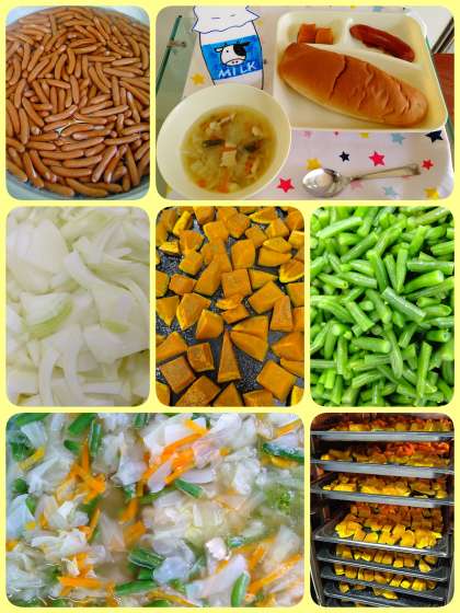 『ウインナーのケチャップソース』は、ゆでたウインナーに、ケチャップ、トンカツソース、ウスターソースを合わせでん粉でとろみをつけたソースをかけています。児童に人気の献立です。『スープ』は、鶏肉を主材に、キャベツ、玉ねぎ、にんじん、青みにさんど豆を使用しています。『焼きかぼちゃ』は、旬の生のかぼちゃに塩で下味をつけ、蒸し焼きにしています。甘みがあって美味しかったです。