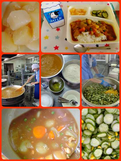 『チキンカレーライス[米粉]』は、鶏肉を主材にした児童に好評な献立です。小麦アレルギーの児童も食べることができるように米粉のカレールウを使用しています。今日は、ラッキー人参の日です。調理員さんがにんじんを色々な形に型抜きをしてくれて、みんなのもとに届きます。桃には、果肉が白色の「白桃」と黄色の「黄桃」があります。きょうは、白桃(カット缶)が登場しました。美味しかったです。