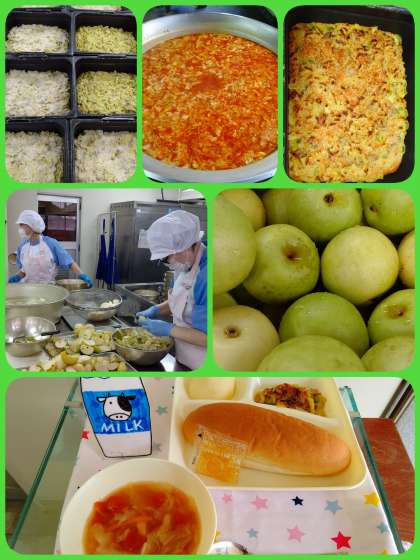 『豆乳マカロニグラタン[米粉]』は、主材にベーコンを使用し、小麦の代わりに上新粉、牛乳やクリームの代わりに豆乳を使用しています。カレー粉やチキンブイヨンなどで味付けしたカレー風味のグラタンです。『トマトスープ』は、鶏肉を主材に、オリーブ油、にんにく、セロリ、トマト(缶)を使用したスープです。旬の果物は、9月2回目登場のなし(二十世紀)です。パンといっしょに美味しく頂きました。
