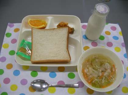スープも「このスープ好き。」と言っている子がたくさんいました。塩味は薄いですが、野菜と鶏肉の味がよくわかるスープでした。(栄養教諭)