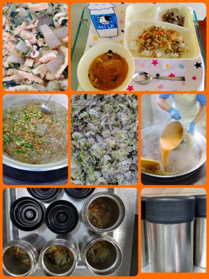 『他人丼』は、牛肉と玉ねぎなどの野菜を甘辛く煮て、卵でとじ、青ねぎで彩りよく仕上げた具をご飯にかけていただきます。卵アレルギーの児童には、卵を除去した他人丼の具を1人ずつ保温ポットに入れて配缶します。とうがんのみそ汁といっしょに美味しく頂きました。