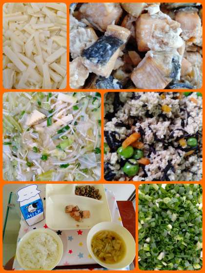 『さけのつけ焼き』は、さけ(角)に料理酒、砂糖、こいくちしょう油で下味をつけ焼いています。『五目汁』は、キャベツ、玉ねぎ、たけのこ、えのきたけ、青ねぎを使用した汁ものです。『高野どうふのいり煮』は、豚ひき肉とだしの旨みを粉末の高野どうふに含ませて仕上げています。どのメニューもごはんによく合う献立で美味しかったです。