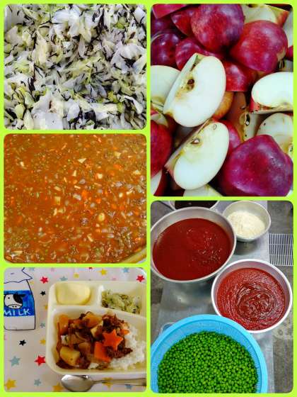 『ハヤシライス[米粉]』は、小麦アレルギーのある児童も食べることができるように、上新粉を使用しています。今日は、星の形やお花の形、ハートの形など色々な形のラッキーにんじんが、児童のもとに届きました。『キャベツのひじきドレッシング』は、蒸したキャベツに、ひじきを使用したドレッシングであえています。デザートのりんごといっしょに美味しく頂きました。