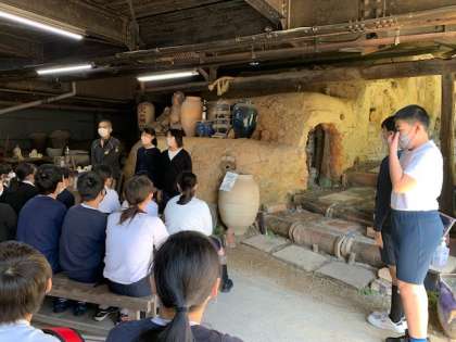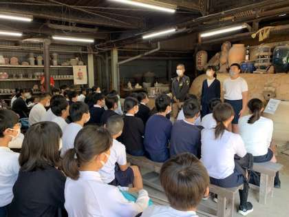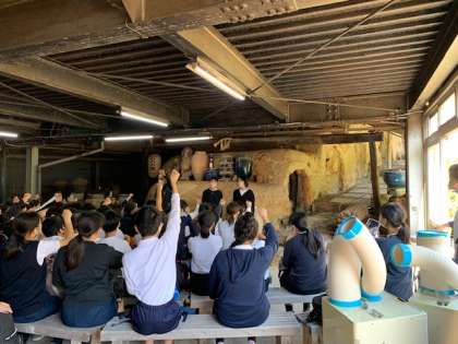 予定通りに信楽陶芸村に到着しました。晴天の中、記念撮影をして信楽焼の説明を聞いています。