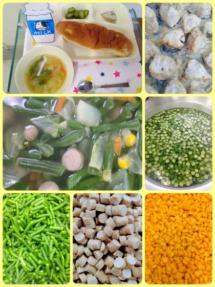 『かつおのマリネ焼き[ノンエッグドレッシング]』は、卵アレルギーの児童も食べることができるノンエッグドレッシングを使っています。塩、こしょう(白)、ノンエッグドレッシングで下味をつけたかつおを焼いています。『ウインナーとじゃがいものスープ』は、ウインナーを主材に、じゃがいも、キャベツ、にんじん、さんど豆、コーンが入った彩りのよいスープです。パンによく合う献立で美味しかったです。