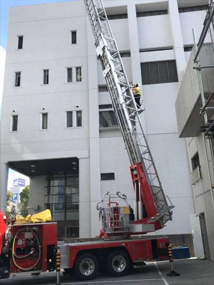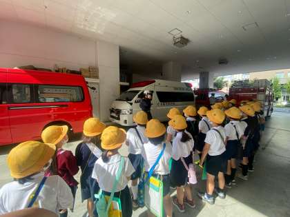 消防署見学に行きました。DVDでお仕事の内容や訓練の様子を見て質問をしたり、消防車に積まれている物や、はしご車のはしごの長さを見たりして、とても驚いていました。消防士の方々のお話をよく聞いて、しっかり学習することができました。