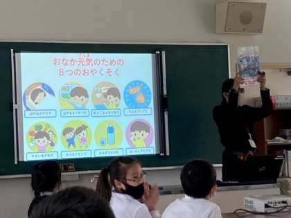 ウンチの状態から、食べ物の栄養を吸収する腸の大切さ、腸に住み着く乳酸菌の働きを解説していただき、いいウンチを出すための生活習慣も学びました。小腸が6mもあることや、お腹の中の菌を一列に並べると地球二周半の長さになることを聞き、驚いていました。