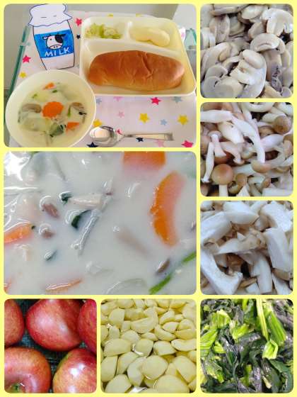 『きのこのクリームシチュー』は、鶏肉を主材にしめじ、エリンギ、マッシュルーム、じゃがいも、たまねぎ、にんじん、青みにほうれん草を使用しています。今日は、ラッキーにんじんでした。星、ハート、お花など色々な形のにんじんが入っています。パンによく合う献立で美味しかったです。