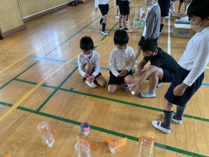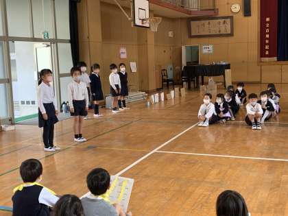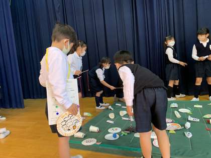先日は講堂を使い1・2年生でおもちゃ大会をしました。2年生の生活科の学習で作ったおもちゃを1年生に遊んでもらいました。2年生は、1年生に遊び方を教えたり得点を数えたりと、お兄さんお姉さんとして優しく関わっていました。1年生は教えてもらった遊び方で楽しく遊んでいました。最後は、2年生が収穫したさつまいもの茶巾絞りをみんなで食べてとても楽しい会となりました。