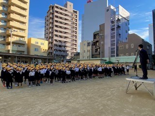今朝は月1回の運動場での児童朝会でした。お天気も良く清々しい朝でした。子どもたちも校長先生のお話をしっかりと集中して聞いていました。