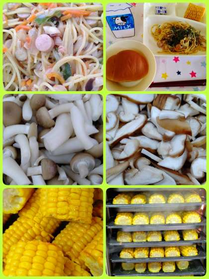 『ウインナーときのこの和風スパゲッティ』は、オリーブ油でにんにくを香りよくいため、ウインナー、ベーコンを主材に、季節の食材のしめじ、しいたけのほかに、玉ねぎ、にんじん、ピーマンを使用し、しょうゆベースの和風の味つけです。喫食時にきざみのりをかけて食べます。『焼きとうもろこし』は、カットコーンが1人1個つき食べごたえがあります。パンによく合う献立で美味しかったです。