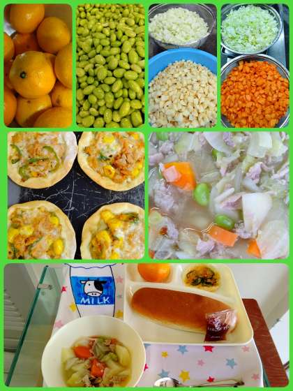 『豚肉と野菜のスープ煮』は、野菜の風味がしっかり感じられる洋風の煮ものです。『変わりピザ』は、ツナ、コーン、ピーマン、ピザソース、チーズを混ぜ合わせて、ぎょうざの皮にのせて焼いています。児童に好評な献立です。コッペパンといっしょに美味しく頂きました。