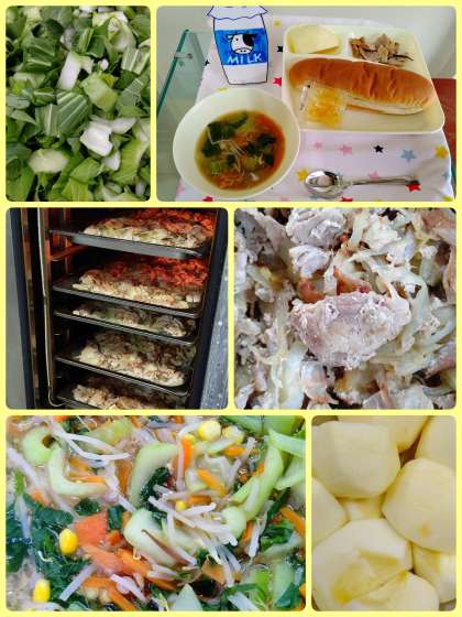 『豚肉のオイスターソース焼き』は、豚肉にしょうが汁、にんにく、オイスターソース、こいくちしょう油、綿実油で下味をつけ、玉ねぎを合わせて焼いています。『中華みそスープ』は、鶏肉、もやし、にんじん、コーン、しいたけ、チンゲンサイ、赤みそを使用した中華味のスープです。デザートにリンゴが1人1/4個ついています。パンによく合う献立で美味しかったです。