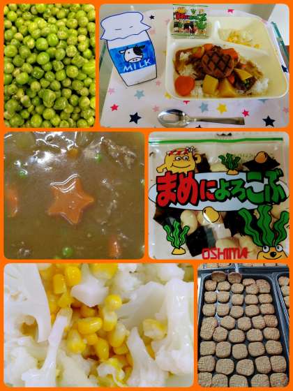 『ハンバーグカレーライス』は、牛肉を主材としたカレーライスに、焼いたハンバーグを添えています。ハンバーグとカレーライスの組み合わせは、児童に大大大好評でした。今日は、色々な形のにんじんが入っているラッキーにんじんの日です。『カリフラワーのピクルス』は、今が旬のカリフラワーとコーンを蒸して、砂糖、塩、ワインビネガーで作ったタレであえています。さっぱりとした味付けで美味しかったです。